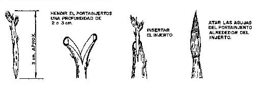 Si se practica el injerto de cuña (ver figura 3) hay que hacer un corte longitudinal en el tronco que sirve de patrón, una vez realizado el corte e insertado el injerto, se venda con rafia y, como en los casos anteriores, se tapa con cera para injertos. Por este sistema se pueden también injertar nuevas ramas, en aquellos lugares del árbol donde su brotación normal, además de difícil, se presentase muy problemático.
